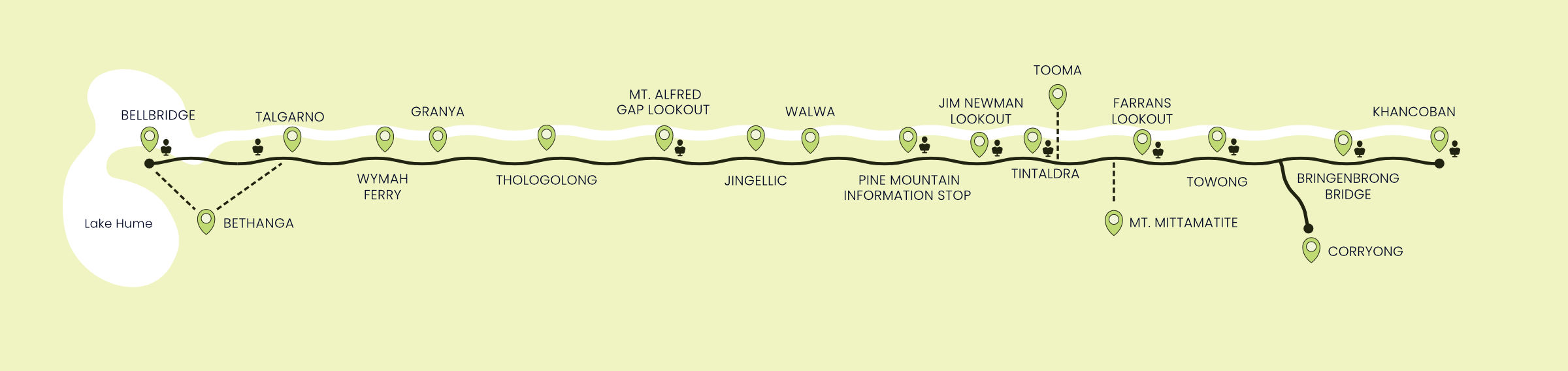 Dotted along the route are several art pieces. The ‘Bogong Moth’ at Jim Newman Lookout and Wood Iron Designs ‘Are we there yet’ installation near Bellbridge are a couple of highlights.